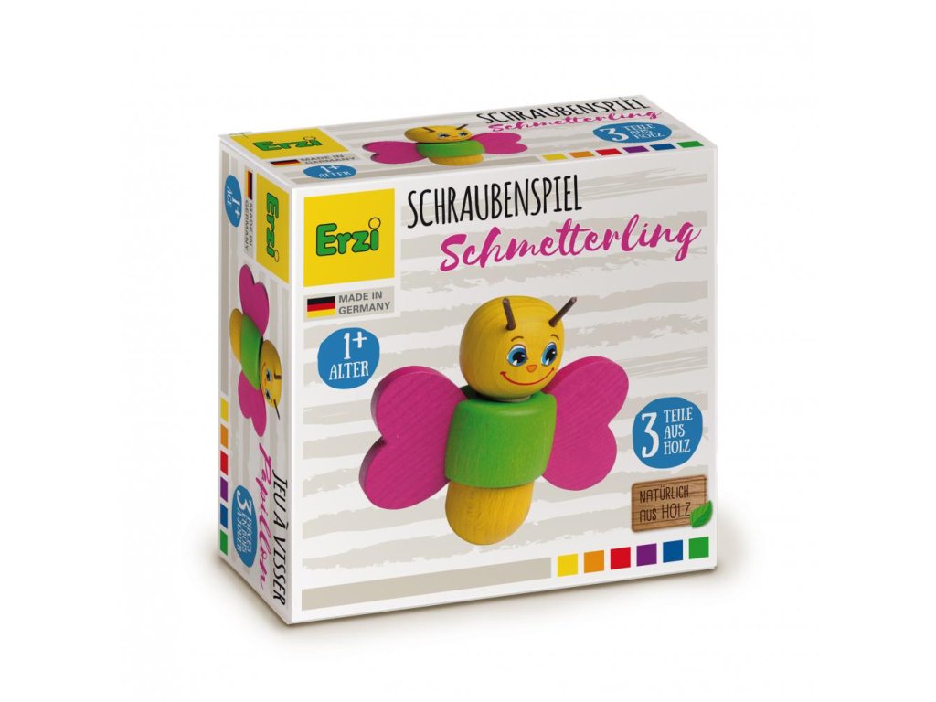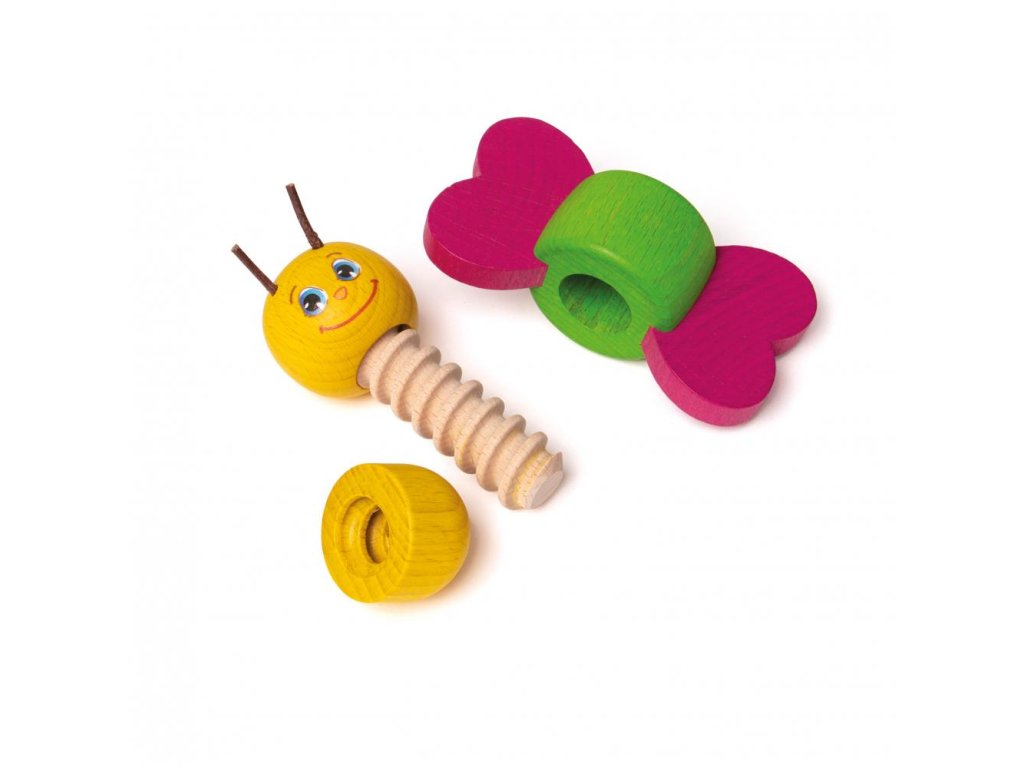 Roztomilý dřevěný motýl s barevnými křídly, která se otáčejí! Jednoduchá šroubovací hračka pro nejmenší ručičky. 3 dílky, které naučí základy skládání a procvičí obratnost.
